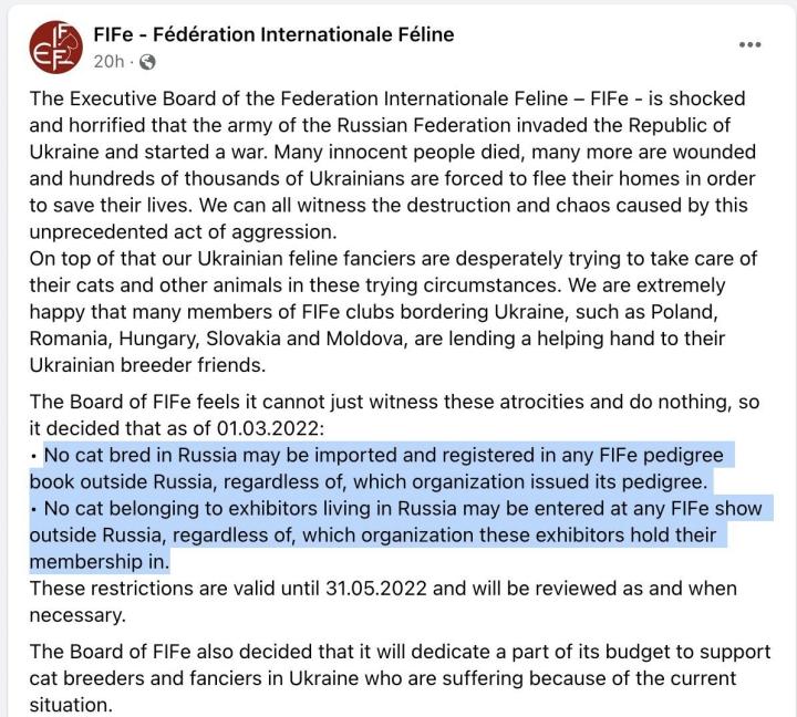 “FIFe无法对这样的暴行坐视不管,于是我们决定:1.禁止引进任何在俄罗斯境内出生、养育的猫,同时俄罗斯的猫也不会得到任何来自FIFe的血统认证;2.禁止俄罗斯的猫参加FIFe旗下的任何展会;3.拨出部分预算,帮助乌克兰的猫。”
