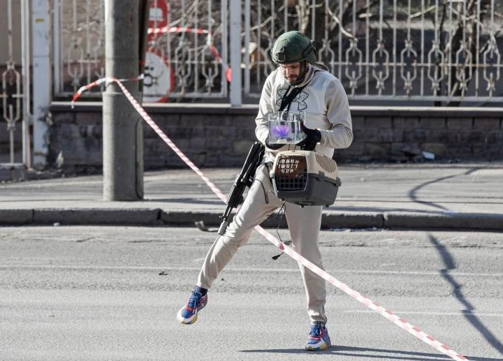 昨日的基辅,一名乌克兰男子抱着他从被导弹摧毁的大楼中救出的一只猫和一条鱼,行走在硝烟弥漫的街道上。