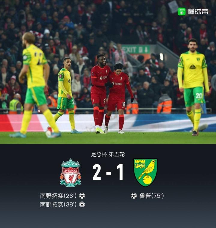 北京时间3月3日04:15,足总杯第五轮继续进行,利物浦坐镇主场迎战诺维奇。上半场,柯蒂斯-琼斯兜射中楣,南野拓实上演梅开二度,奥里吉送助攻。下半场,张伯伦中柱,鲁普远射破门为诺维奇扳回一城。最终,利物浦主场2-1单赛季四杀诺维奇,晋级足总杯8强。