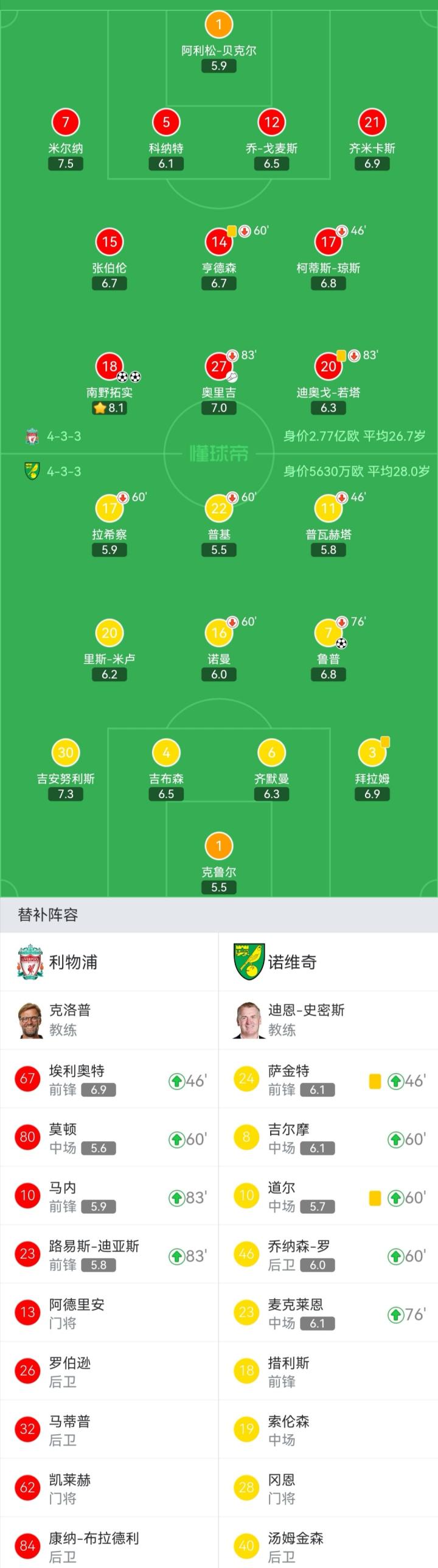 利物浦首发:1-阿利松-贝克尔、7-米尔纳、12-乔-戈麦斯、5-科纳特、21-齐米卡斯、14-亨德森(60'80-莫顿)、15-张伯伦、17-柯蒂斯-琼斯(46'67-埃利奥特)、20-迪奥戈-若塔(83'10-马内)、27-奥里吉(83'23-路易斯-迪亚斯)、18-南野拓实