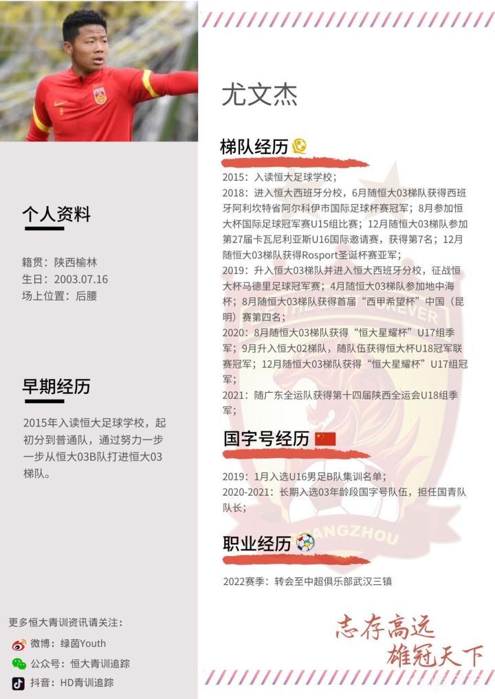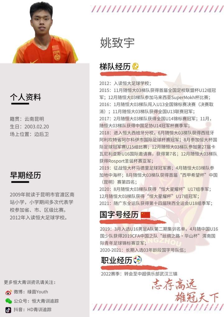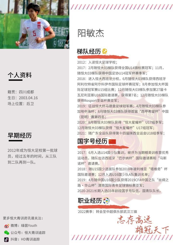 恒大03梯队姚致宇、阳敏杰、尤文杰转会至中超俱乐...恒大青训追踪 @懂球帝2022-03-03 12:28恒大03梯队姚致宇、阳敏杰、尤文杰转会至中超俱乐部武汉三镇!2012-2022,十年光阴,你们和队友们并肩作战,为足校赢取一个又一个荣誉,并通过努力一步步走向国字号队伍。不知不觉到了出去闯荡的年纪,从青训球员到职业球员的转变仍有一段距离,加油,不负韶华不负青春!我们会一直关注你们的成长!展开更多