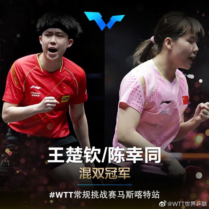 WTT常规挑战赛马斯喀特站:王楚钦/陈幸同3-0取胜获混双冠军 体坛万象 体坛万象2022-03-04 23:01在刚刚结束的WTT常规挑战赛马斯喀特站比赛中,中国组合王楚钦/陈幸同3-0击败对手成功夺冠。决赛面对印度组合塔卡尔/卡玛斯,王楚钦/陈幸同没有给对手太多机会,最终直落三局拿下比赛,三局比分分别为11-3,11-3,11-6。展开更多