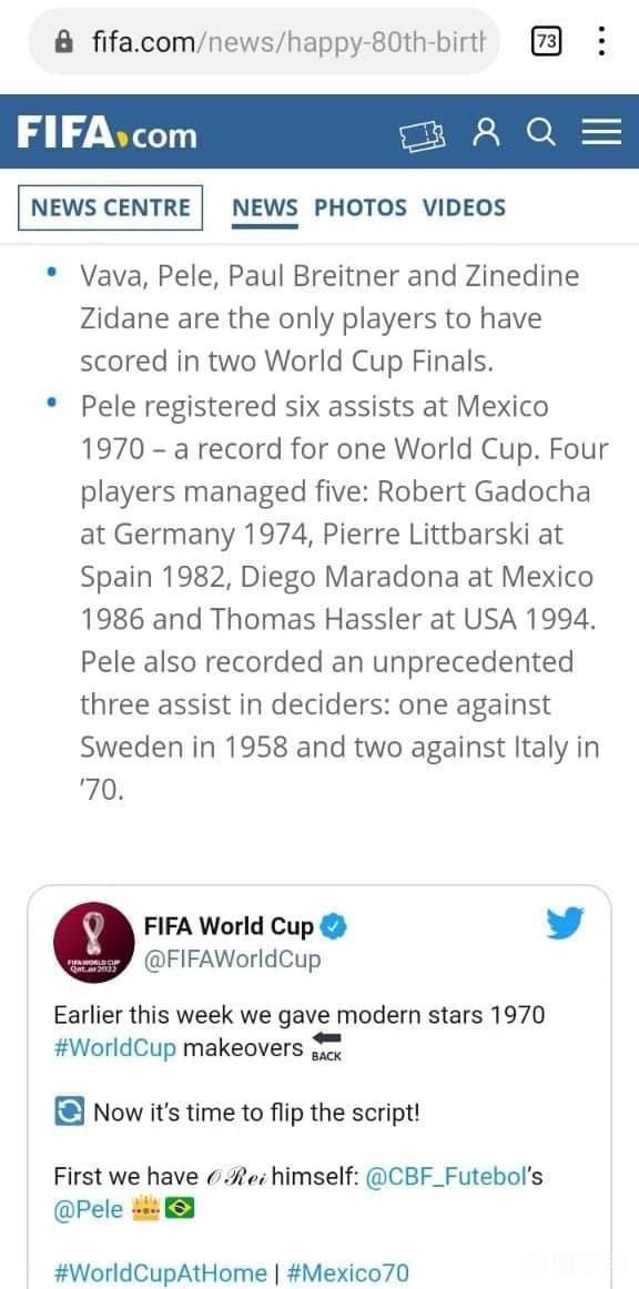 贝利生涯决赛数据:26场29球13助攻。世界杯历...