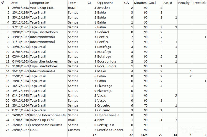 贝利生涯决赛数据:26场29球13助攻。世界杯历史上只有4名球员在两届决赛中都有过进球,贝利就是其中一位。1958年世界杯决赛对阵瑞典17岁的贝利梅开二度,1970年世界杯决赛对阵意大利贝利打进1球并送出了两次助攻。此外在南美解放者杯的决赛上,贝利也为桑托斯拿过两次冠军。1962年对阵佩纳罗尔,他打进2球;1963年对阵博卡青年的两回合,贝利打进1球送出1次助攻。
