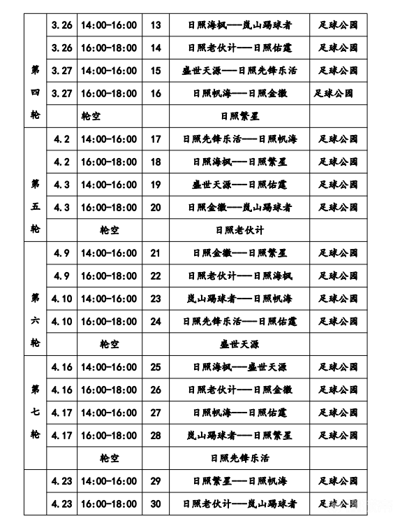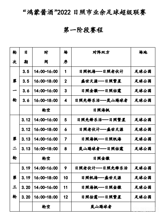 “鸿蒙酱酒”2022日照市业余足球超级联赛于20...潇栋- @懂球帝2022-03-05 17:13“鸿蒙酱酒”2022日照市业余足球超级联赛于2022年3月5号下午两点在日照足球公园12号场地正式开赛,比赛共吸引日照帆海、日照老伙计、日照盛世天源、日照繁星、日照金徽、日照佑霆、日照先锋乐活、岚山踢球者、日照海枫等9支队伍参加。赛事分为两个阶段,第一阶段9支队伍进行单循环赛事排定名次;前五名进入第二阶段争冠组,单循环五轮比赛后决出最终名次,后四名进行单循环三轮比赛赛排定名次。展开更多