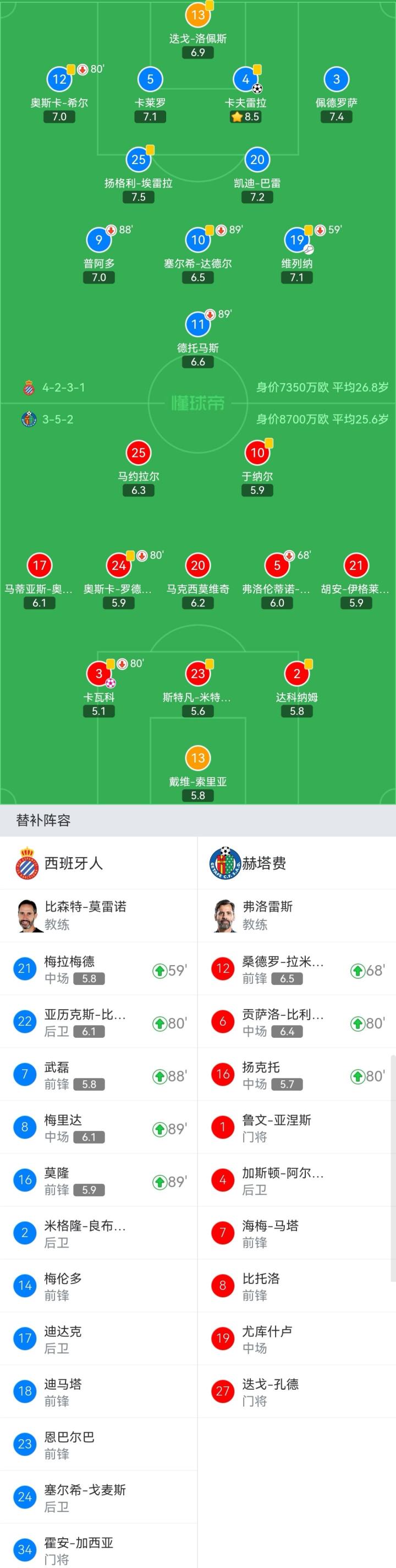 西班牙人首发:13-迭戈-洛佩斯、12-奥斯卡-希尔(80'22-亚历克斯-比达尔)、5-卡莱罗、4-卡夫雷拉、3-佩德罗萨、20-凯迪-巴雷、25-扬格利-埃雷拉、10-塞尔希-达德尔(89'8-梅里达)、19-维列纳(59'21-梅拉梅德)、9-普阿多(89'7-武磊)、11-德托马斯(89'16-莫隆)