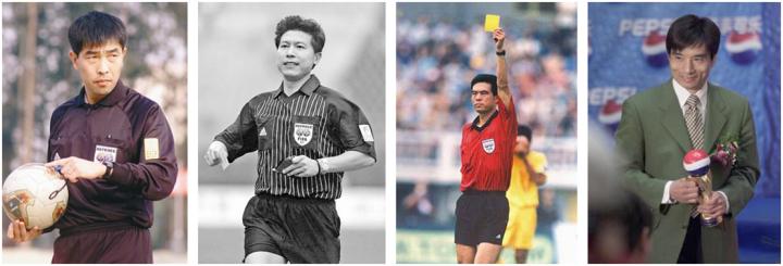 陆俊(左一)、龚建平(左二,已故)、张建军(右二)、孙葆洁(右一,2001赛季甲A联赛最佳裁判)