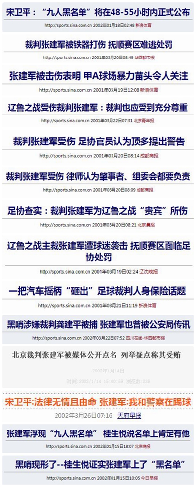 二十年前有媒体报道称,黑哨涉嫌裁判龚建平被捕前,张建军也曾被公安局传讯,甚至这位北京裁判被媒体点名称其受贿!除此之外,21世纪初的足坛“反黑”风暴,浙江绿城老总宋卫平和广州吉利老板声称掌握了8名黑哨的名单,两家俱乐部甚至联手向新华社和中国足协提供了“九人黑名单”,张建军均位列其中。不过由于种种原因,名单并没有公布于众。