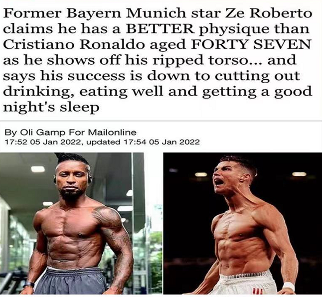 泽罗伯托将在今年7月年满48岁,但丝毫未见老态的他在近期接受了天空体育的专访,这位已经退役多年但壮心不已的前巴西国脚甚至开启了玩笑:“我认为如果我继续踢球可以在曼城踢个中场,因为那是一支永远不会丢失球权的球队。”另外再度被问及和C罗比较的话题,泽罗伯托依旧表示“尽管C罗像个机器,但我并不认为C罗在40岁后能够继续踢球。”无独有偶,早在今年年初接受太阳报采访时,泽罗伯托就向C罗发起挑战:“我有很好的身体素质,我一直踢到了43岁,如果C罗可以跟我一样踢到43岁,那么我才会说他身体素质比我好。”泽罗伯托的自律程度绝对有资格和C罗相提并论,甚至强过于C罗。C罗在2018年转会尤文时的体脂数据为7%,而据媒体透露,泽罗伯托退役后的体脂率依旧维持于5.6%。