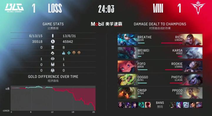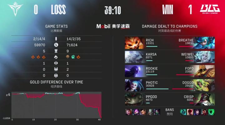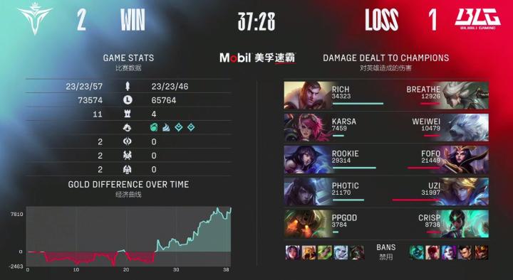 第39分钟,BLG选择RUSH拿到大龙击杀V5四人后一波结束比赛,恭喜BLG先下一城。