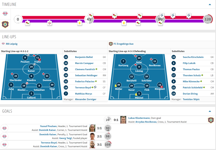 2014-2015赛季的德国杯,莱比锡红牛作为德乙球队取得了新的突破。2014年10月29号主场迎战奥厄,开场不久克洛斯特曼便打进乌龙球,此后球队陷入长时间的落后。终于在最后时刻,凯泽站了出来!凯队助攻波尔森头球破门把比赛拖入加时。加时第98分钟,凯泽队长罚入点球,主场彻底沸腾。10分钟后,又是凯泽,助攻特伦斯·博伊德头球破门!这场3:1的胜利永载史册,成为凯泽队长一个人的表演,他帮助莱比锡成功实现救赎,首次晋级德国杯16强。