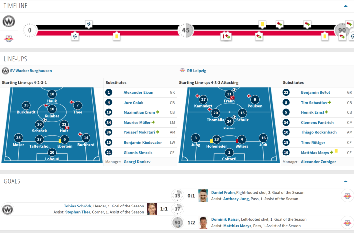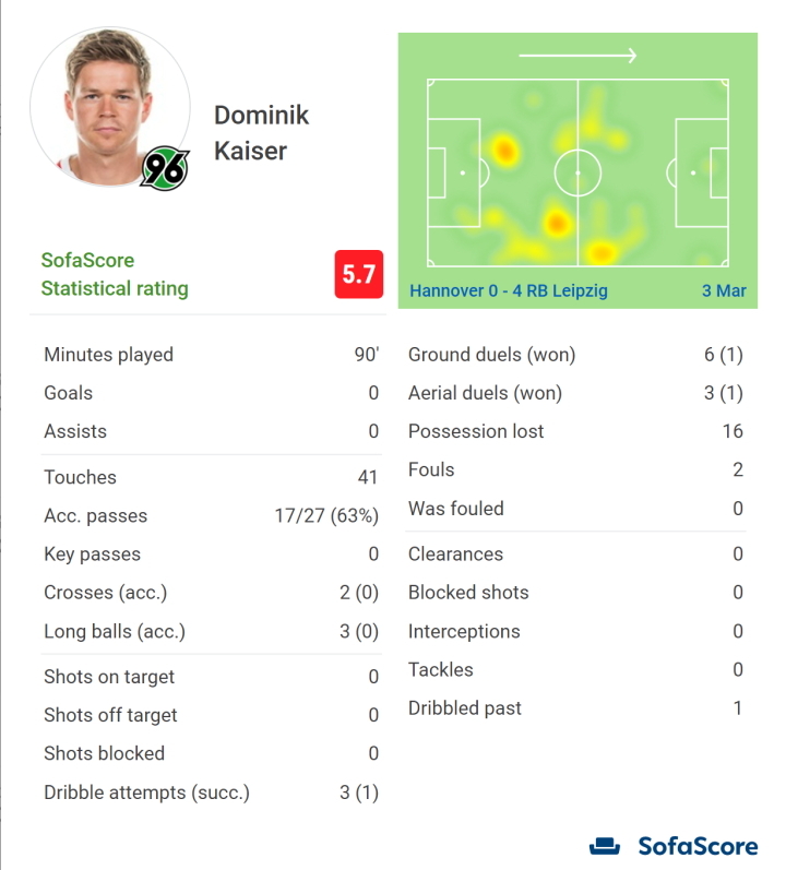 2021-2022赛季德国杯,凯泽在与莱比锡红牛一役中的个人数据。