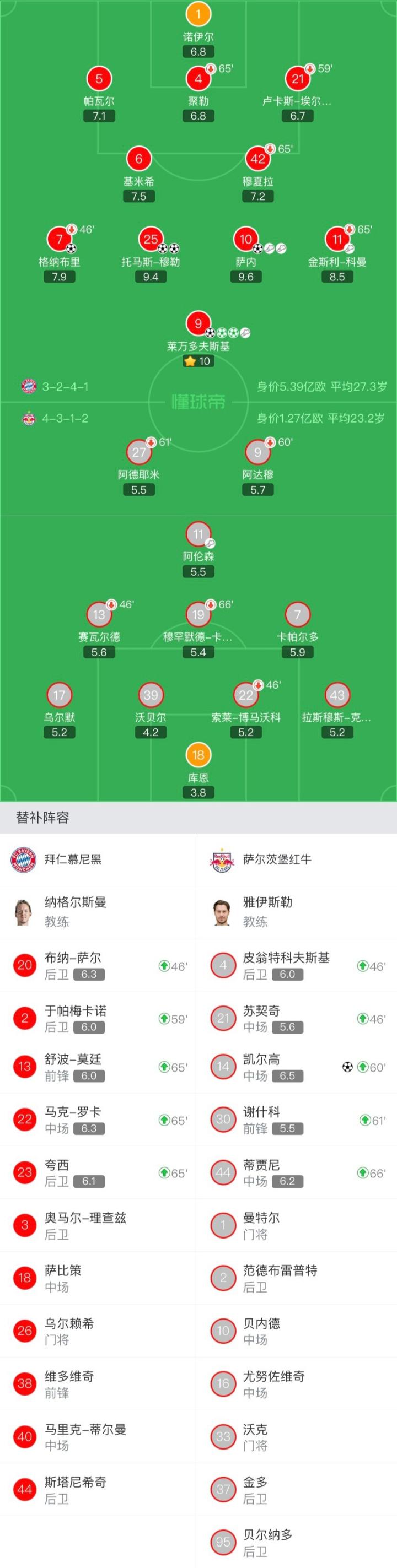 拜仁慕尼黑首发:1-诺伊尔、21-卢卡斯-埃尔南德斯(59'2-于帕梅卡诺)、4-聚勒(66'23-夸西)、5-帕瓦尔、42-穆夏拉(65'22-马克-罗卡)、6-基米希、11-金斯利-科曼(66'13-舒波-莫廷)、10-萨内、25-托马斯-穆勒、7-格纳布里(46'20-布纳-萨尔)、9-莱万多夫斯基