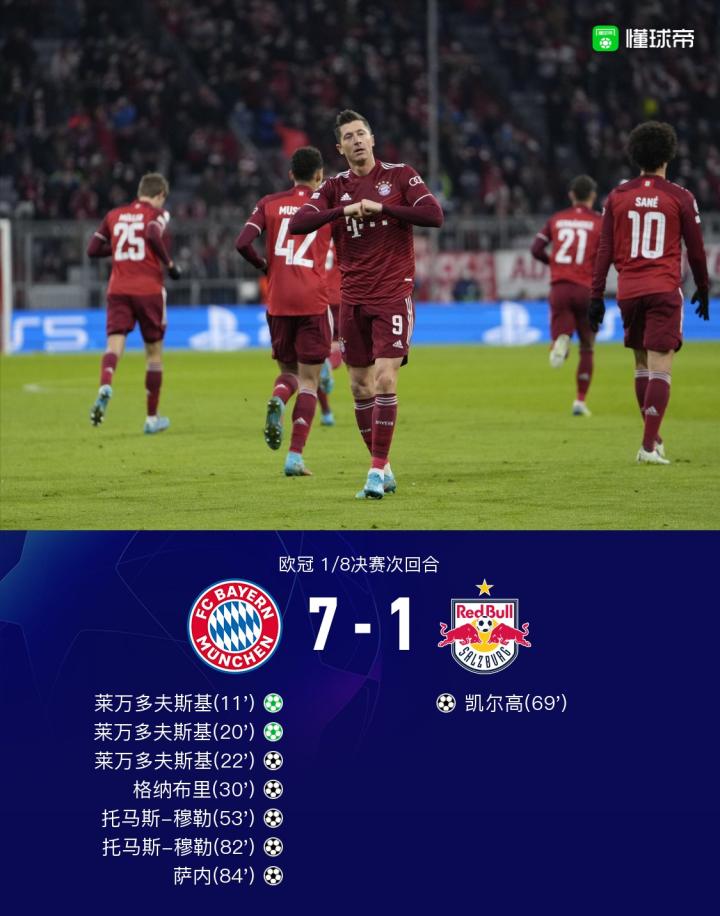拜仁7-1萨尔茨堡红牛,总比分8-2晋级八强,莱万22分钟戴帽