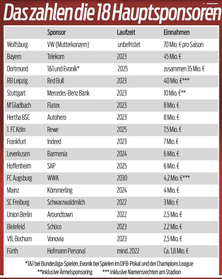 最近拜仁慕尼黑在计划与德国电信、卡塔尔航空以及安联等多个赞助商续约。德国媒体《体育图片报》列出了目前德甲18支球队的主赞助商每年的赞助费,其中大众为狼堡每年赞助7000万欧,是德甲各队中主赞助商赞助费最高的。