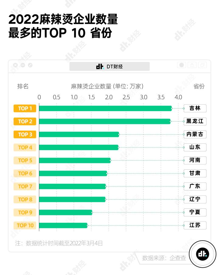 企查查显示,目前国内的麻辣烫相关企业已经达到32.8万家,超过8000家的省份共有14个,其中东北兄弟吉林与黑龙江齐头并进,坐拥超过3万家麻辣烫企业。