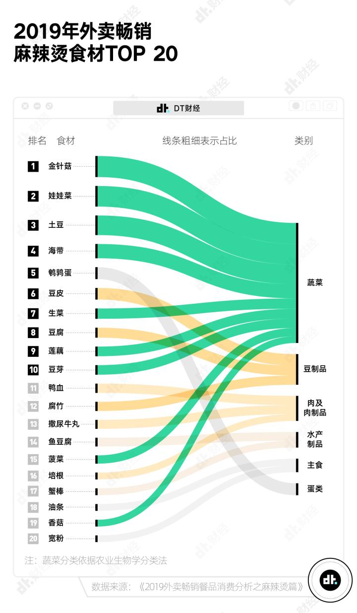 根据《2019外卖畅销餐品消费分析之麻辣烫篇》,平均每份麻辣烫外卖里含有10种食材,最受消费者喜爱的食材是金针菇、娃娃菜和土豆。值得注意的是,排名前10的食材中一块肉也没有。