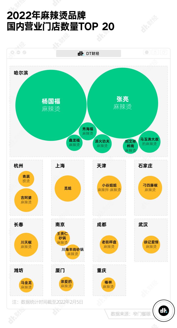 实际上,不少麻辣烫品牌都来自哈尔滨宾县这个神奇的地方。因为杨国福率先打响麻辣烫生意第一枪,同县人纷纷加入了这支队伍。在国内营业门店数量TOP20的麻辣烫品牌中,有7个都来自哈尔滨。