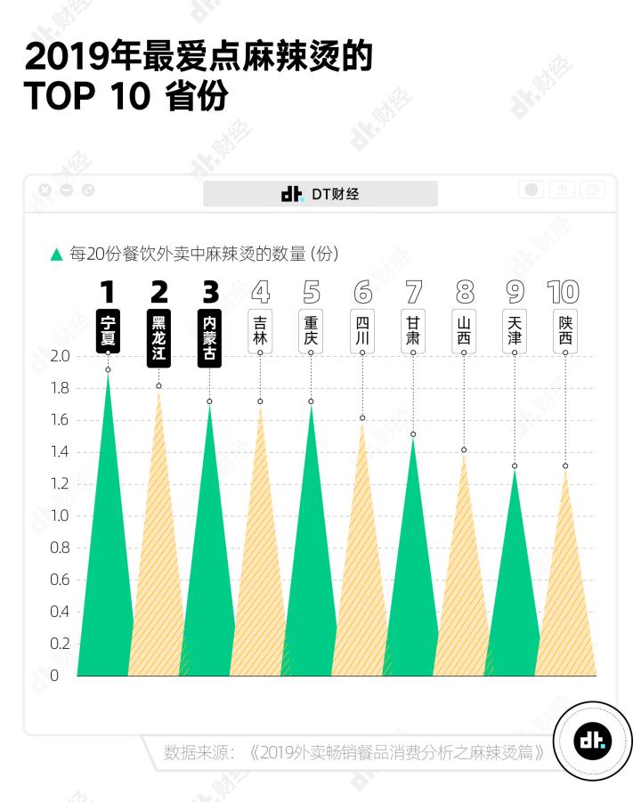 根据《2019外卖畅销餐品消费分析之麻辣烫篇》,宁夏人民夺下了“最爱麻辣烫”冠军称号,平均每20份外卖中就有1.9份麻辣烫,而“麻辣烫第二故乡”黑龙江则排在第2位。