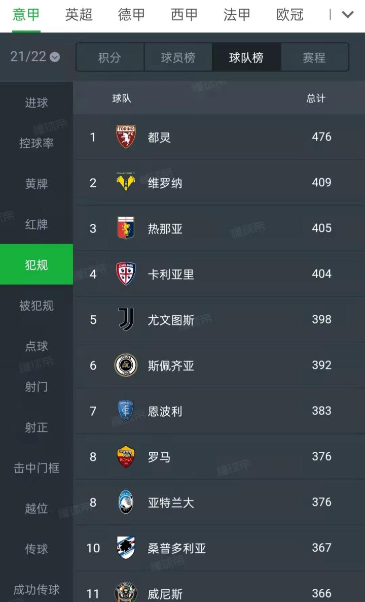 本赛季目前,都灵全队的犯规次数,意甲第一。
