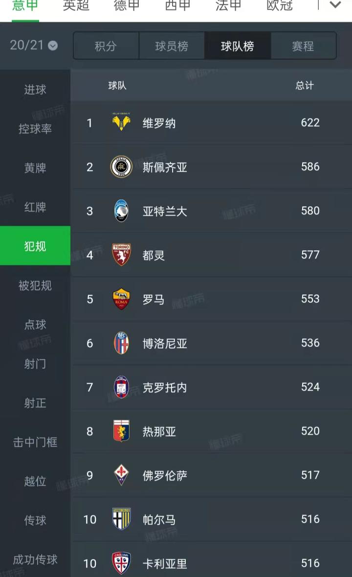 尤里奇上赛季执教的维罗纳,也是20-21赛季犯规次数,意甲第一名。