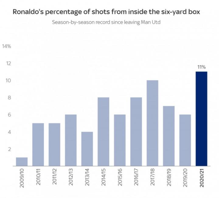 (图)C罗的小禁区内得分占比逐渐攀升。