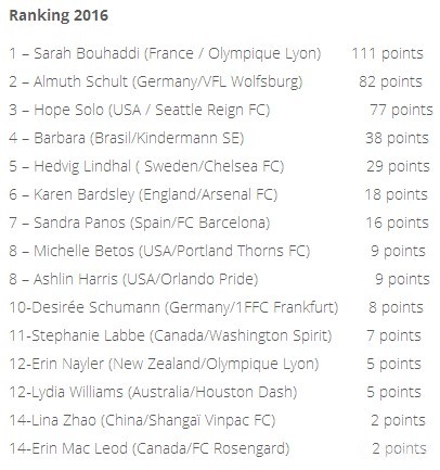 近日,国际足球历史和统计联合会(IFFHS)公布了2016年度世界女足门将排名,中国女足门将赵丽娜位列第14位,现效力于里昂女足的法国门将萨拉-布哈迪当选年度最佳。