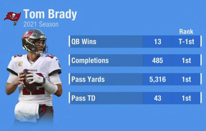 上个赛季,44岁的布雷迪在多项数据上依然领跑全联盟