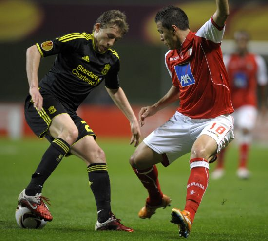 11年前欧联1/8决赛首回合,布拉加在主场1:0力克利物浦。图为利物浦前锋卢卡斯·雷瓦(现拉齐奥球员)和布拉加球员罗德里戈·利马·桑托斯争抢球权的场景。此前没人会想到这支葡萄牙球队居然能够闯进决赛。
