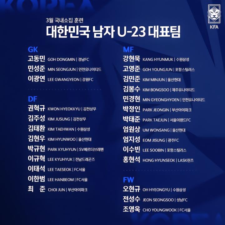 今天,韩国国奥队也公布了最新的集训名单,这份名单中可谓是黄善洪出战杭州亚运会的真正底牌。因为在名单中,26人全部来自于职业俱乐部,其中2人来自于海外俱乐部,分别是德乙不莱梅的中卫朴规现和奥地利甲级联赛林茨的中场洪铉硕。其余24人中,18人来自K1联赛,6人来自K2联赛。而K1联赛的精英,诸如FC首尔的曹永旭、李韩汎、李太锡,水原三星蓝翼的金泰焕、姜铉默、吴贤揆,蔚山现代的严原上、金炫佑、金旻俊,浦项铁人的高映埈、李秀彬,以及在今年K1联赛表现出色的城南前锋田成秀都榜上有名。而在K2联赛中,釜山的“蔚山双子星”崔浚和朴正仁的入选,更显得这支球队的星光熠熠。这是黄善洪带队以来的第三期集训名单,客观来说这是一份很强的韩国国奥队人员名单。如果不出太大的意外,杭州亚运会的主力框架呼之欲出。