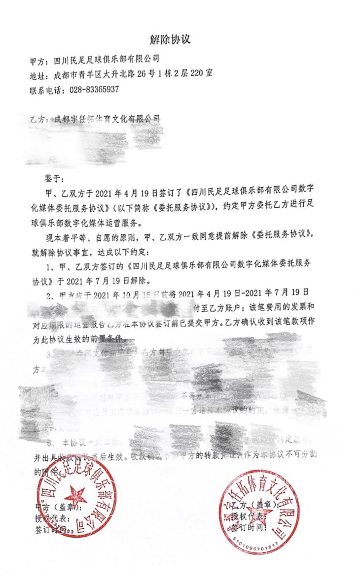 我司服务金额不高,但在服务过程中尽心尽力,希望助力本土俱乐部发展。而四川民足完全违背了契约精神和基本的做人经商准则,同时也没有遵守与办公场所、旗下球员、训练基地、联赛的各种契约,已经是一个毫无诚信可言的企业。这样的所谓投资方参与中国职业足球,我们深表遗憾。