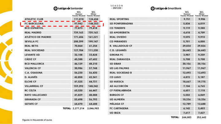 近日,西甲联盟发布了冬窗更新后的本赛季西甲西乙各队阵容开支上限,即“工资帽”。最引人瞩目的莫过于巴塞罗那,红蓝军团的工资帽从夏窗时的9,800万欧元调整至-1.44亿,成为两级联赛42支球队中唯一顶着负工资帽的俱乐部。