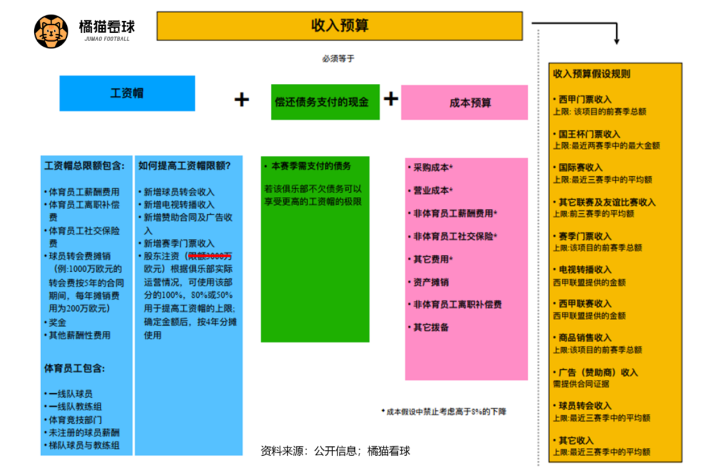 西甲的财政预算制度相当繁琐,制定标准长达245页。俱乐部预算需满足盈亏平衡要求,以收定支,根据预估的收入、现金流变动及一系列计算规则制定新赛季的支出预算。