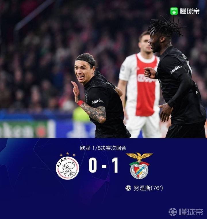 【阿贾克斯0-1本菲卡,总比分2-3无缘八强,努涅斯头槌制胜】