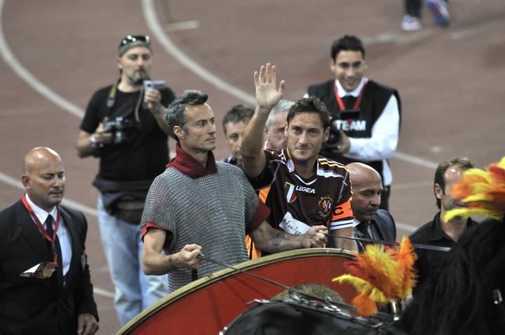 随后极具古罗马气息的演出开始,托蒂和齐达内分别乘坐战车,并在身穿铠甲的将士的护送下登场,两辆马车最终在东面看台的主席台前汇合。身着罗马球衣的坎德拉出现在球场中央,他动情地说:“谢谢。谢谢所有人!”