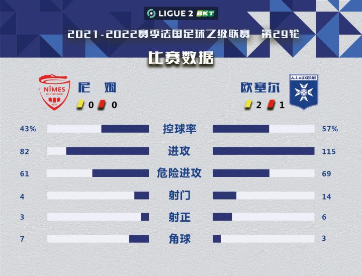 随着尼姆体能下降,欧塞尔逐渐掌握了比赛的主动权。直至比赛结束,双方也没有改写比分,欧塞尔延续了自己火热的状态,客场2-1战胜了尼姆。
