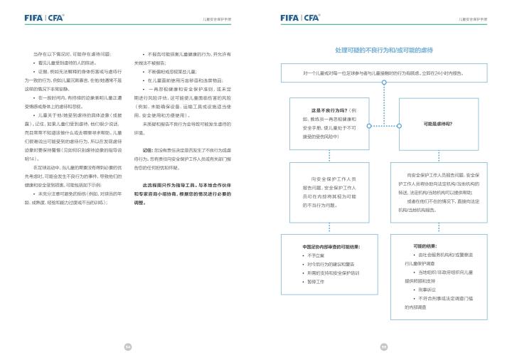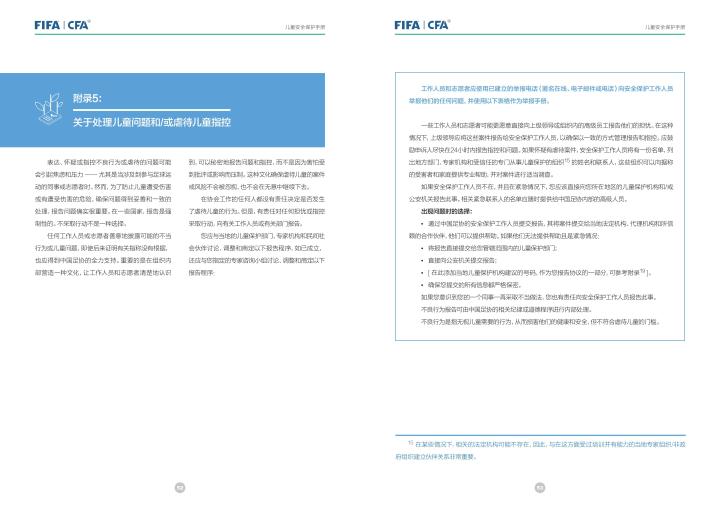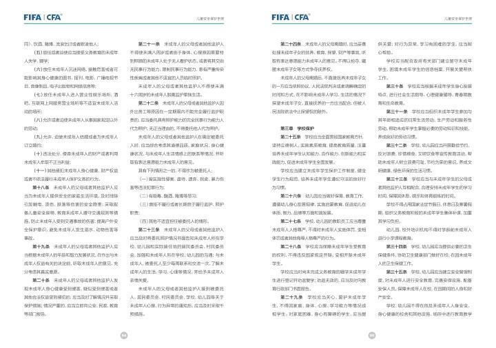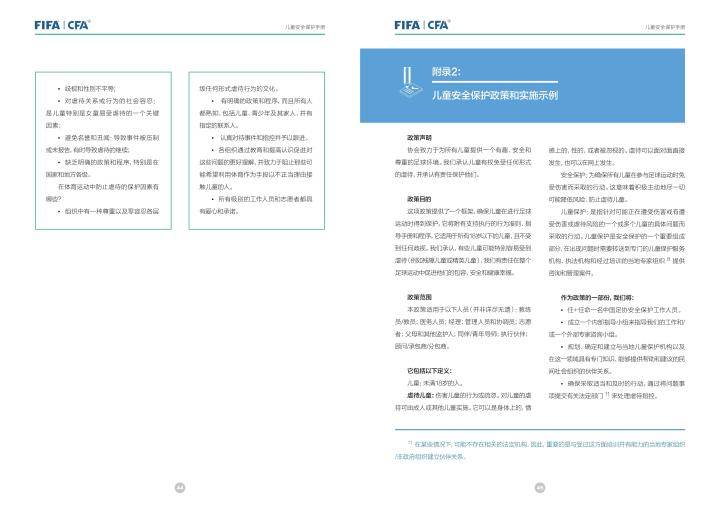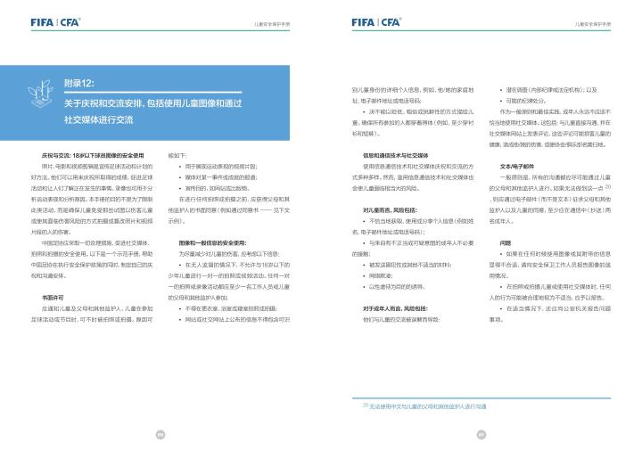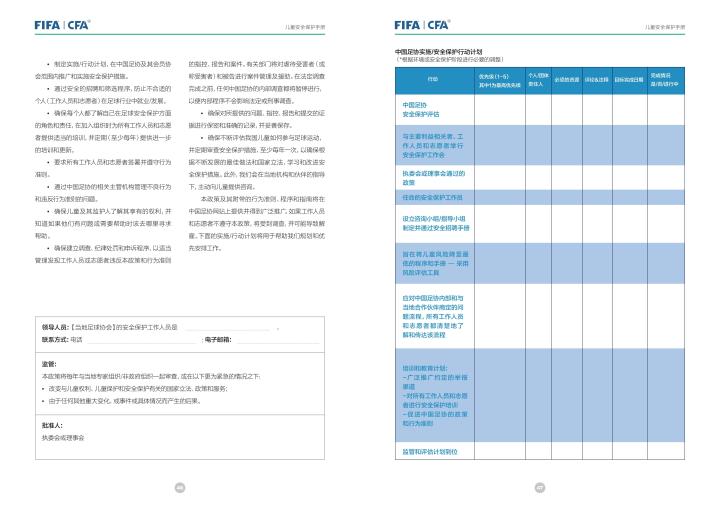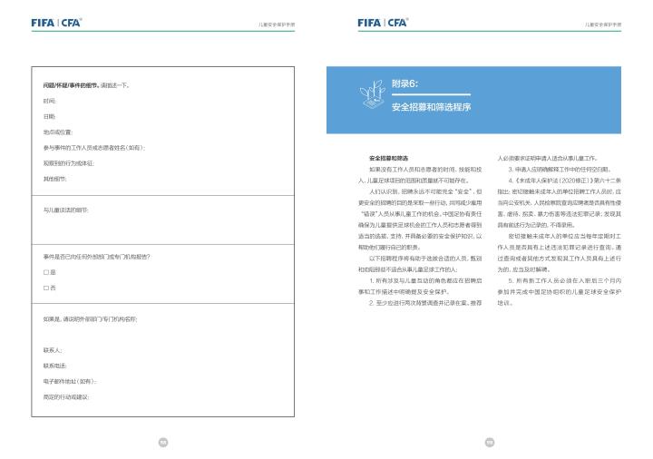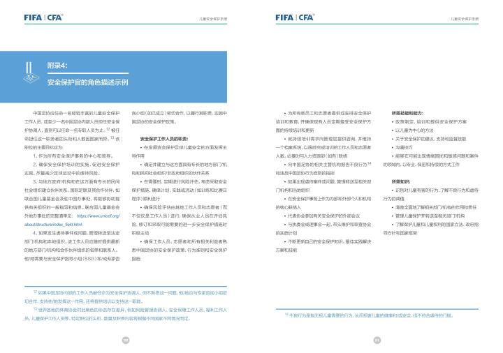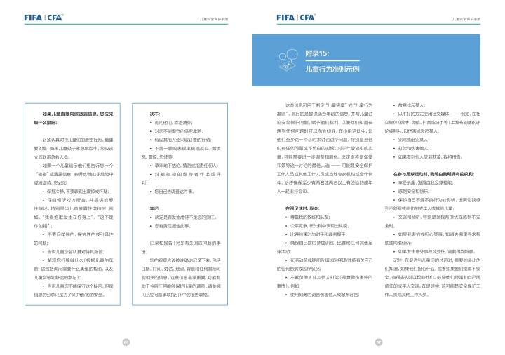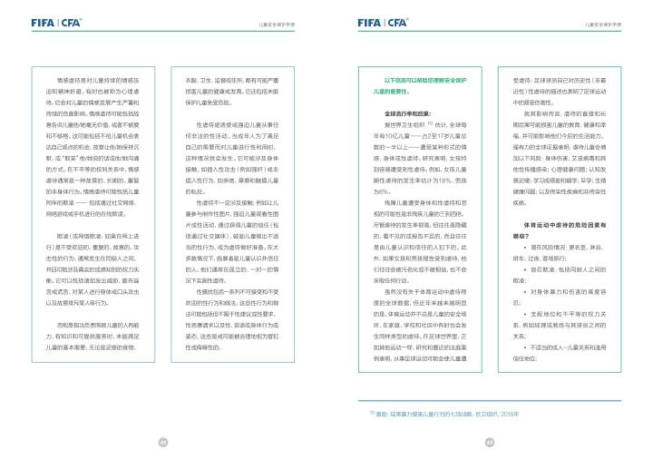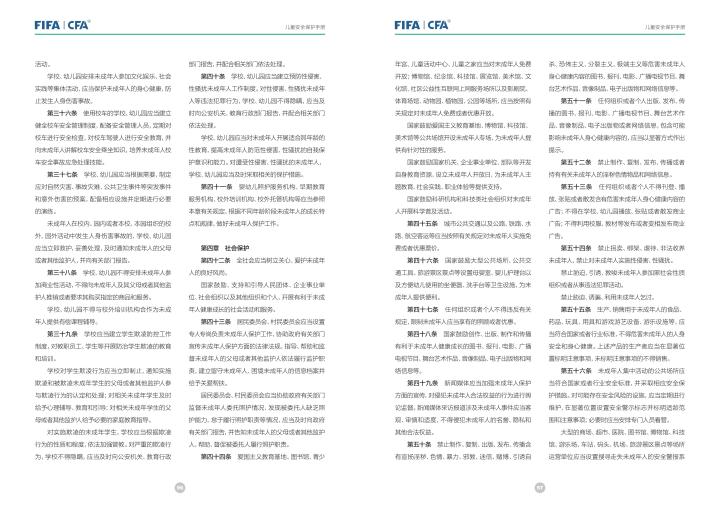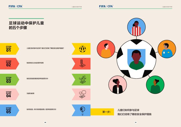 国际足联自2020年起成立了儿童安全保护部门(FIFA Safe Guarding),旨在推广足球活动中的青少年儿童安全保护工作,确保青少年儿童在健康良好的足球环境中学习和成长,免受足球训练中来自外界的身心伤害,并为此开设了相关课程。中国足协社会足球部根据国际足联发布的《儿童安全保护指南》编译制作了《中国足球协会儿童安全保护指南》和相关宣传页,并将在后续响应国际足联号召,成立中国足协儿童安全保护小组。