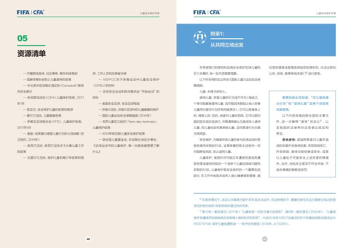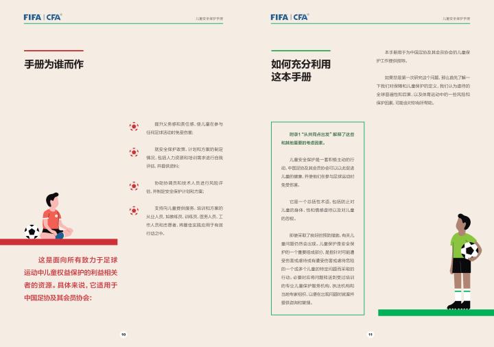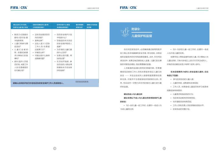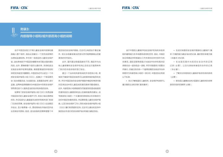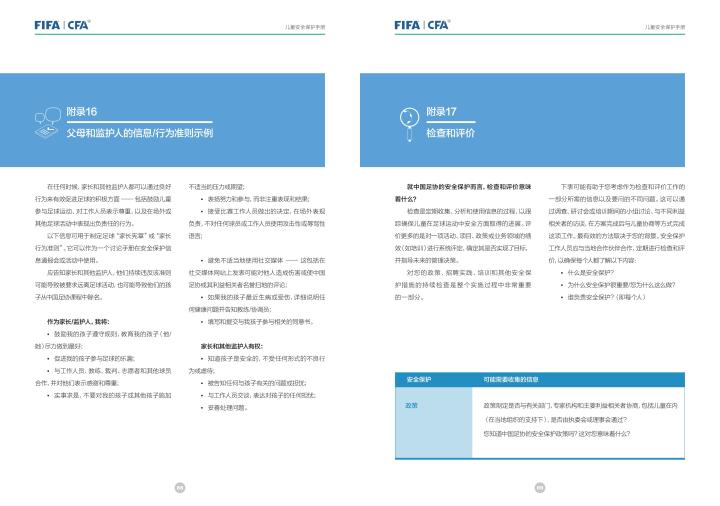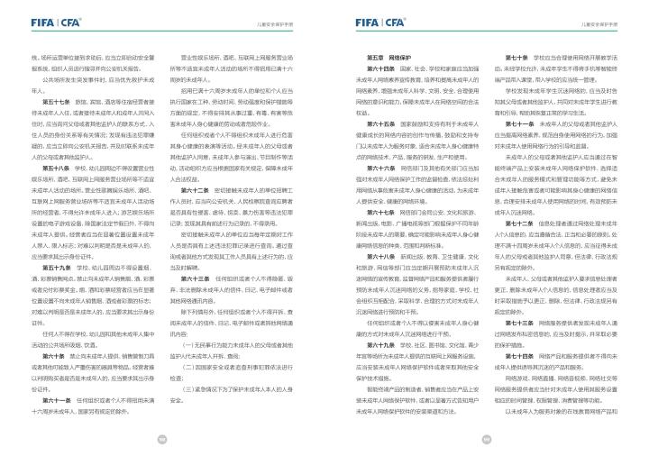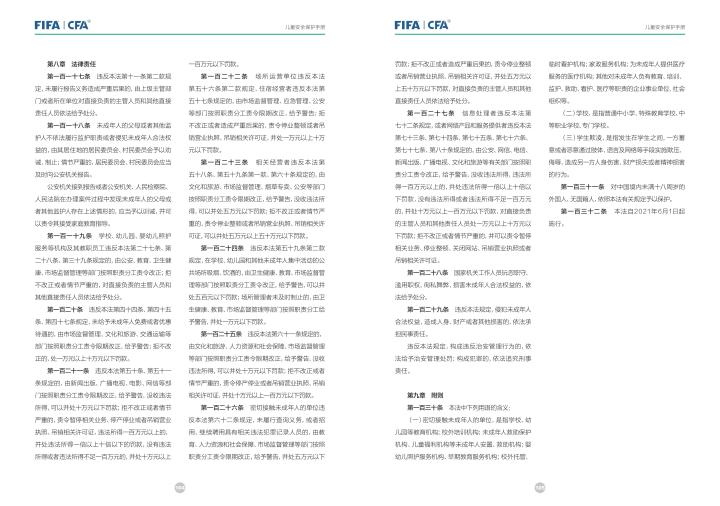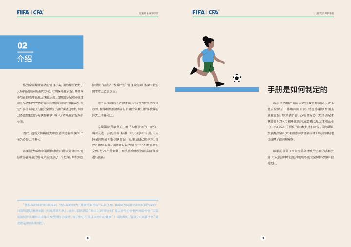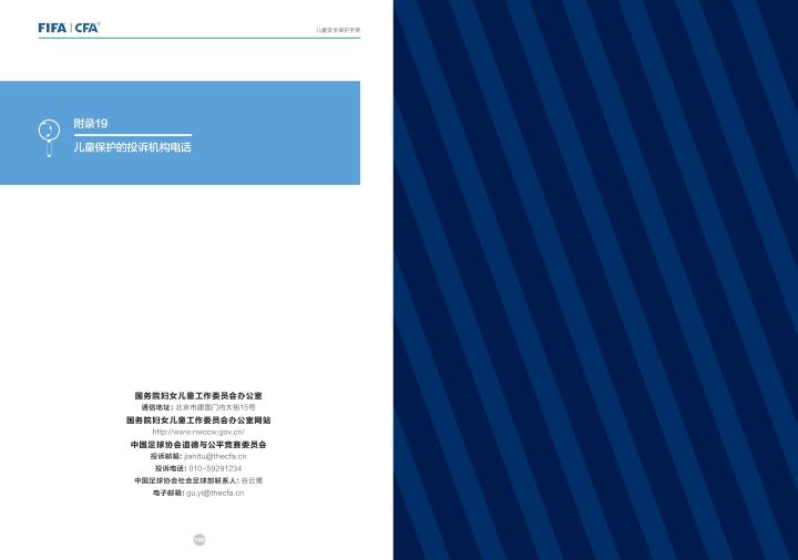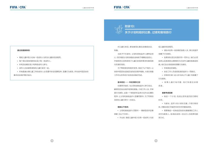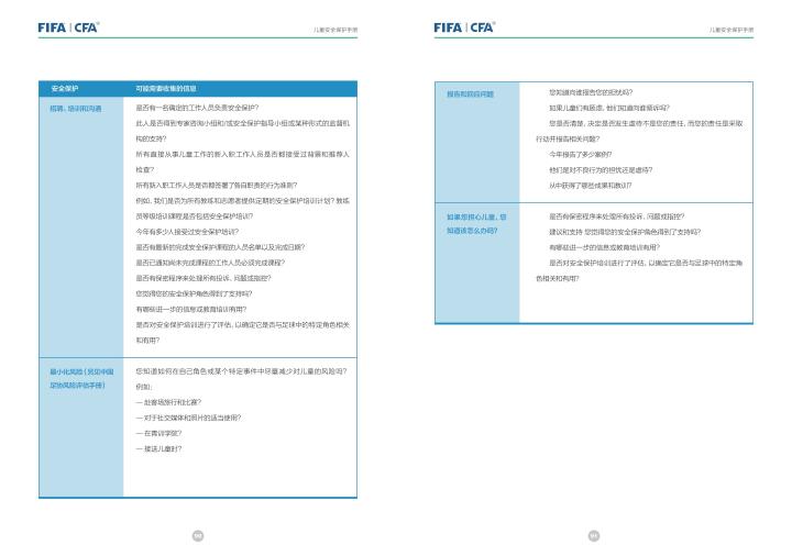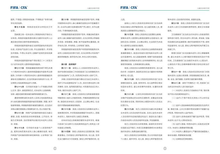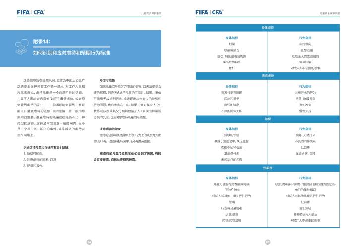 国际足联自2020年起成立了儿童安全保护部门(FIFA Safe Guarding),旨在推广足球活动中的青少年儿童安全保护工作,确保青少年儿童在健康良好的足球环境中学习和成长,免受足球训练中来自外界的身心伤害,并为此开设了相关课程。中国足协社会足球部根据国际足联发布的《儿童安全保护指南》编译制作了《中国足球协会儿童安全保护指南》和相关宣传页,并将在后续响应国际足联号召,成立中国足协儿童安全保护小组。