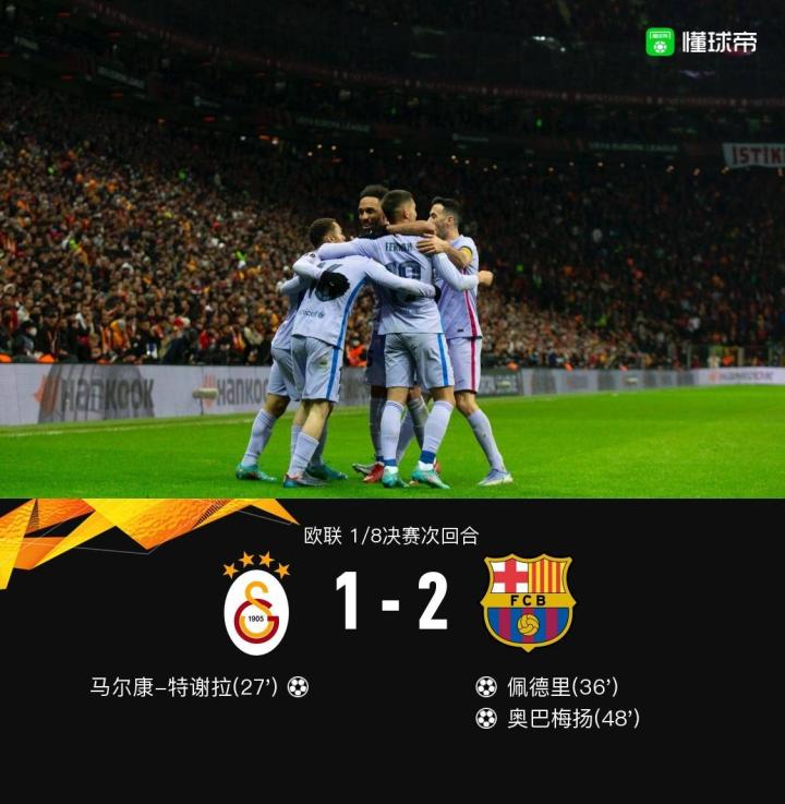 北京时间3月18日01:45,欧联1/8决赛次回合,巴塞罗那客场挑战加拉塔萨雷,首回合两队互交白卷。上半场,马尔康-特谢拉鱼跃冲顶首开记录,费兰-托雷斯助攻佩德里闲庭信步推射扳平比分,奥巴梅扬头槌中楣。下半场,奥巴梅扬垫射一击制胜,德斯特伤退。最终,巴萨客场2-1逆转加拉塔萨雷,总比分2-1晋级欧联8强。