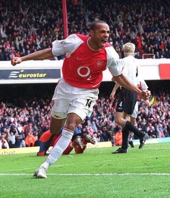 然而即使是这样的亨利,也有“情绪失控”的时刻。这里所谓的情绪失控,对于他人来说是再平常不过的忘情庆祝,但对亨利自己而言,是他不愿展现出的一面,而这一面,只展现给海布里。这一幕不曾出现在安联球场,不曾出现在伯纳乌,也不存在于法兰西。他03-04赛季联赛第32轮面对利物浦的长途奔袭,他在球场中挥舞双臂忘情庆祝。