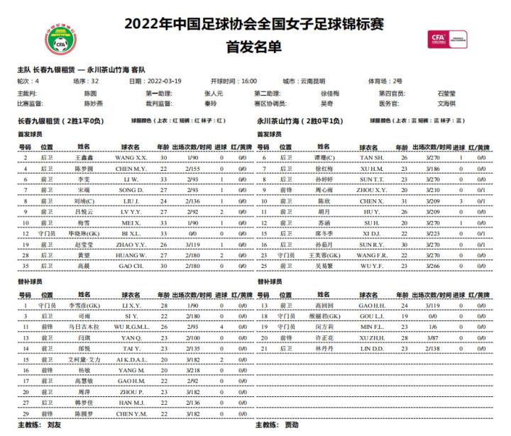 2022女足锦标赛 排位赛 长春九银租赁VS永川茶山竹海 双方首发