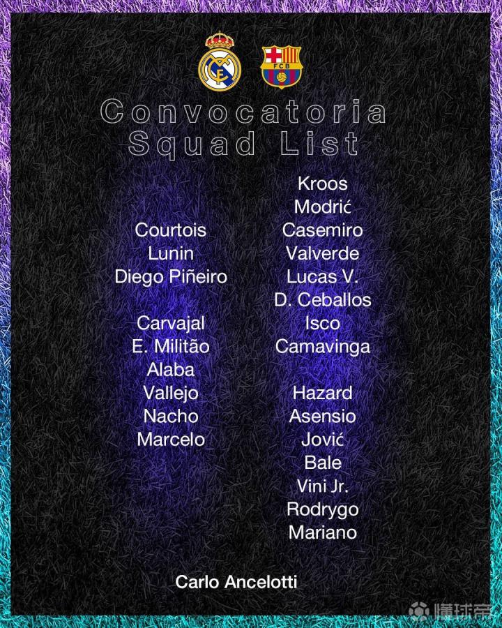 前锋:阿扎尔,阿森西奥,约维奇,贝尔,维尼修斯,罗德里戈,马里亚诺