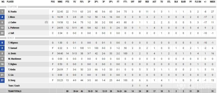 NBL战报:刘传兴未出场,弗兰克斯22+11,子弹88-98负太攀蛇