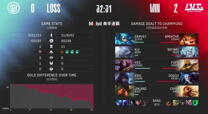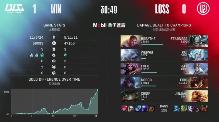 第30分钟,BLG推上高地直接一波结束比赛,恭喜BLG先下一城。