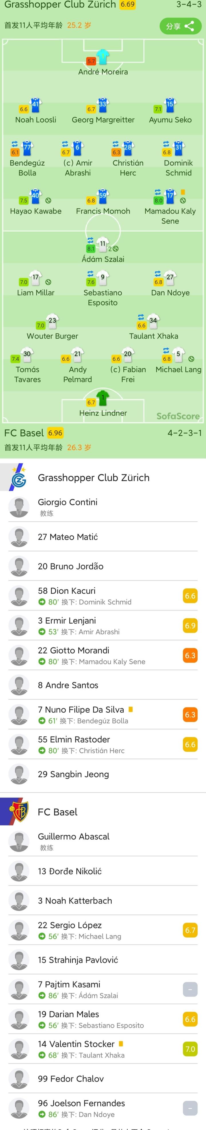 巴塞尔首发:1-林德纳、5-米夏埃尔-兰、21-佩尔马德、20-弗莱、30-托马斯-塔瓦雷斯、34-陶兰特-扎卡、23-布格尔、17-利亚姆-米勒、9-埃斯波西托、27-恩多耶、11-绍洛伊替补