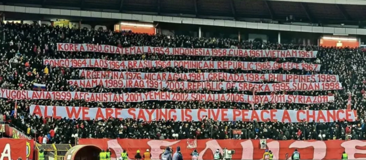 红白色的横幅上面密密麻麻地列出这些年来被美国和北约“光顾”过的20多个国家或地区的名字和年份,当然,包括“Yugoslavia1999”。看台上最醒目的一条横幅,用大一号的字体写着“All we are saying is give peace a chance”,这是约翰·列侬创作的反战歌曲《给和平一个机会》中的一句歌词。