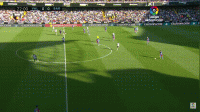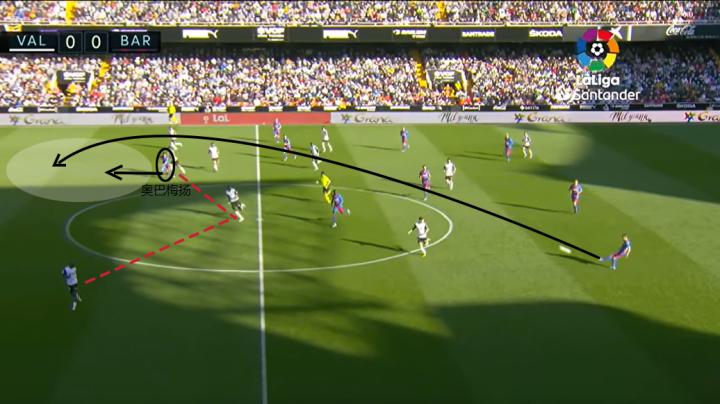 我们来看上面这张图片,巴萨重将在拿球后的传导并未集中在中场区域,而是长时间由后防线球员参与组织,逼迫瓦伦西亚整体站位前压,侧面为埋伏在前锋线上奥巴梅扬创造了反越位空间。