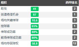 可以发现,自哈维上任以来,除了0:3不敌拜仁的比赛中控球率只有48%,巴萨在其余26场比赛中都可以在控球率上占到优势——对阵奥萨苏纳控球率72%、对阵毕巴控球率72%、对阵阿拉维斯控球率76%,即便在面对皇马这样的顶级强队时,巴萨的控球率也能超过60%。