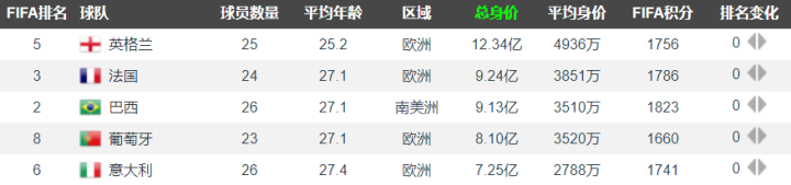【Top 1:英格兰国家队 总身价12.34亿欧元】