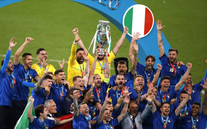 意大利国家队在2021年举办的欧洲杯赛场上一鸣惊人,拿到了最终的冠军,在英格兰的主场捧杯。